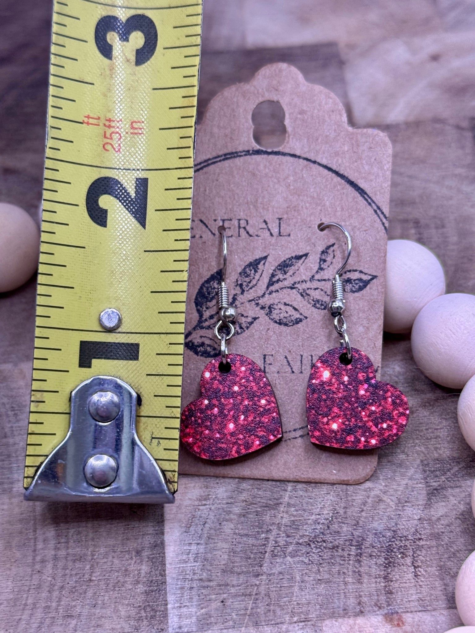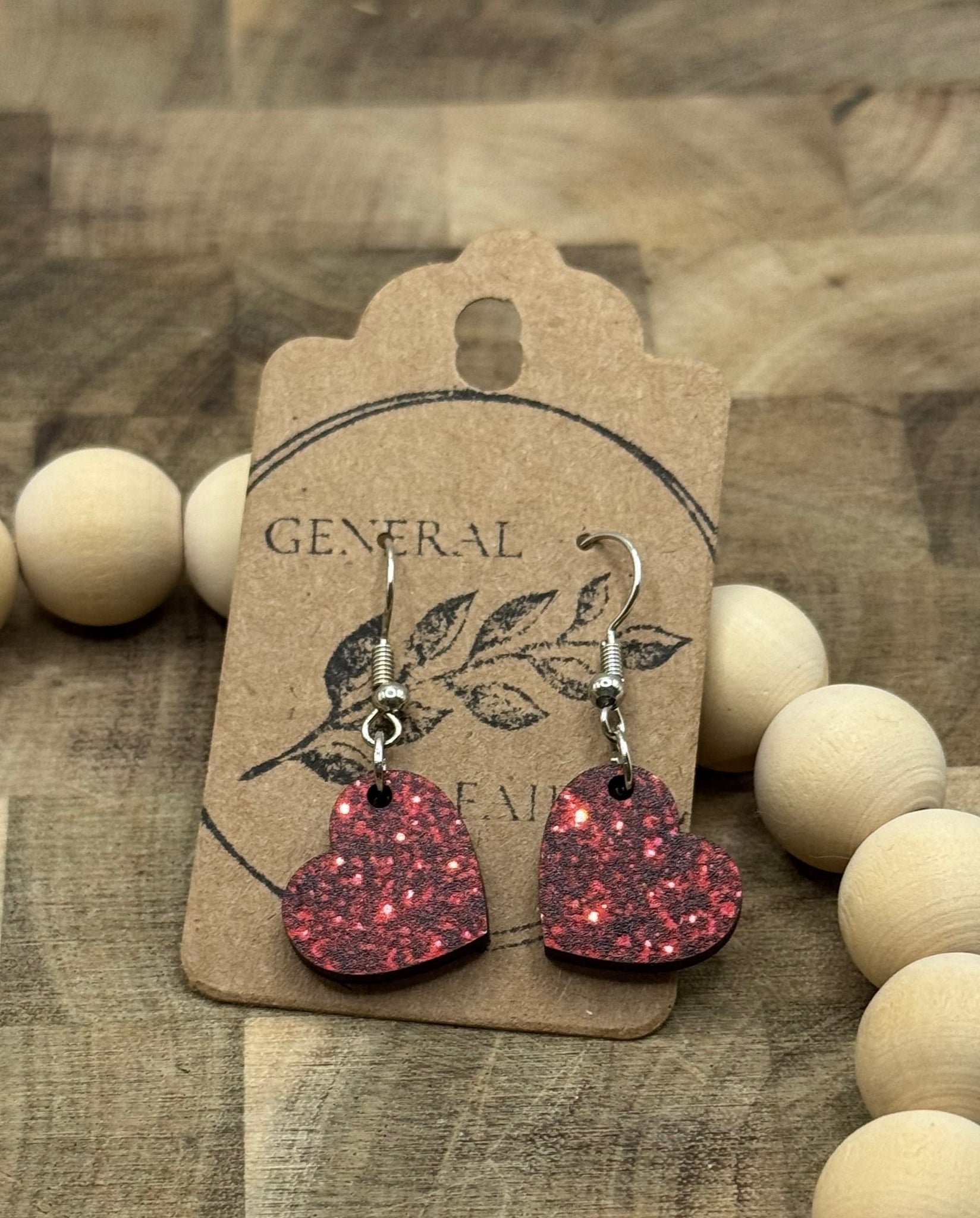 Material: Heart-shaped wood earrings printed with a smooth design to give the illusion of a sparkling heart. Each earring will be different based on the random design on the material.